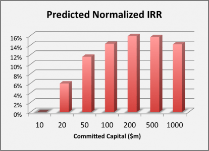 The brain-trust at HBS (Felda & Josh Lerner) came up with similar data that shows that the optimal fund size is $200M or so (credit to Todd Hixon of New Atlantic for the graphic):