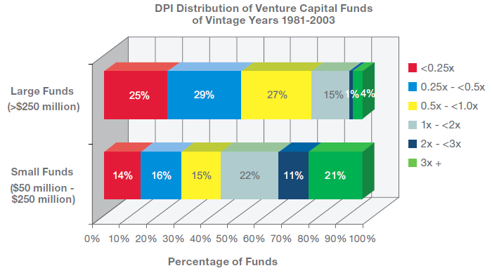 They looked at 850 funds and found that only 5% of funds over $250M have ever distributed greater than >2.0x capital  (so-called DPI) to their Limited Partners. That is a pathetic statistic for the venture industry.