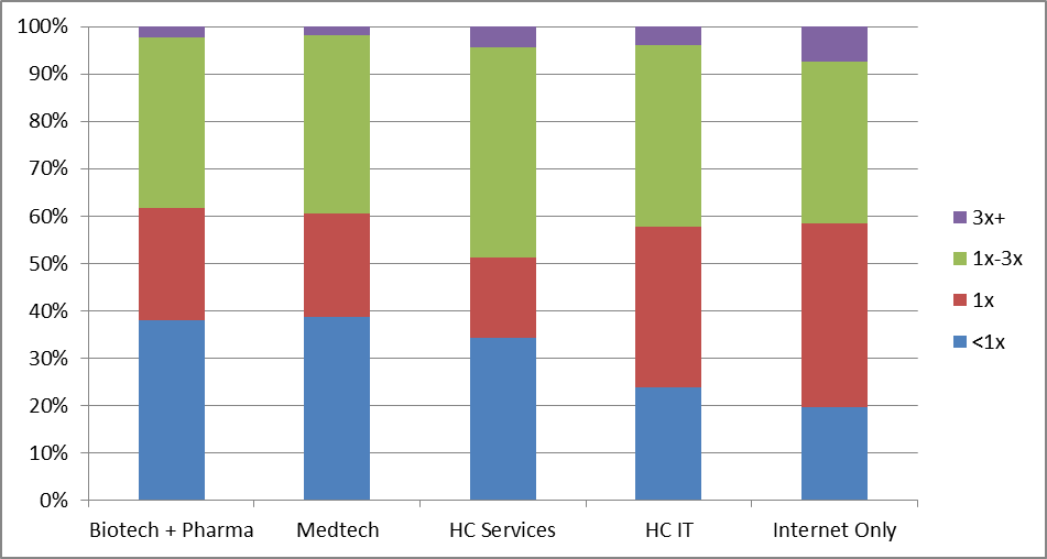Compare that to the internet sub-sector of IT – which is the sub-sector that LPs and industry watchers mostly focus on.  For internet companies, only 20% of all investment rounds are being carried at less than 1x and a whopping 7% are being carried at 3x+ their original cost.