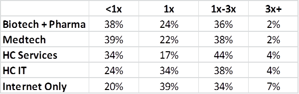 This disparity between sectors at the two ends of the returns curve is notable. We explored the reasons behind it in the article last summer – and capital efficiency clearly has alot to do with it. It’s harder to have marked up rounds when so much capital has to go into healthcare companies vs. tech companies.